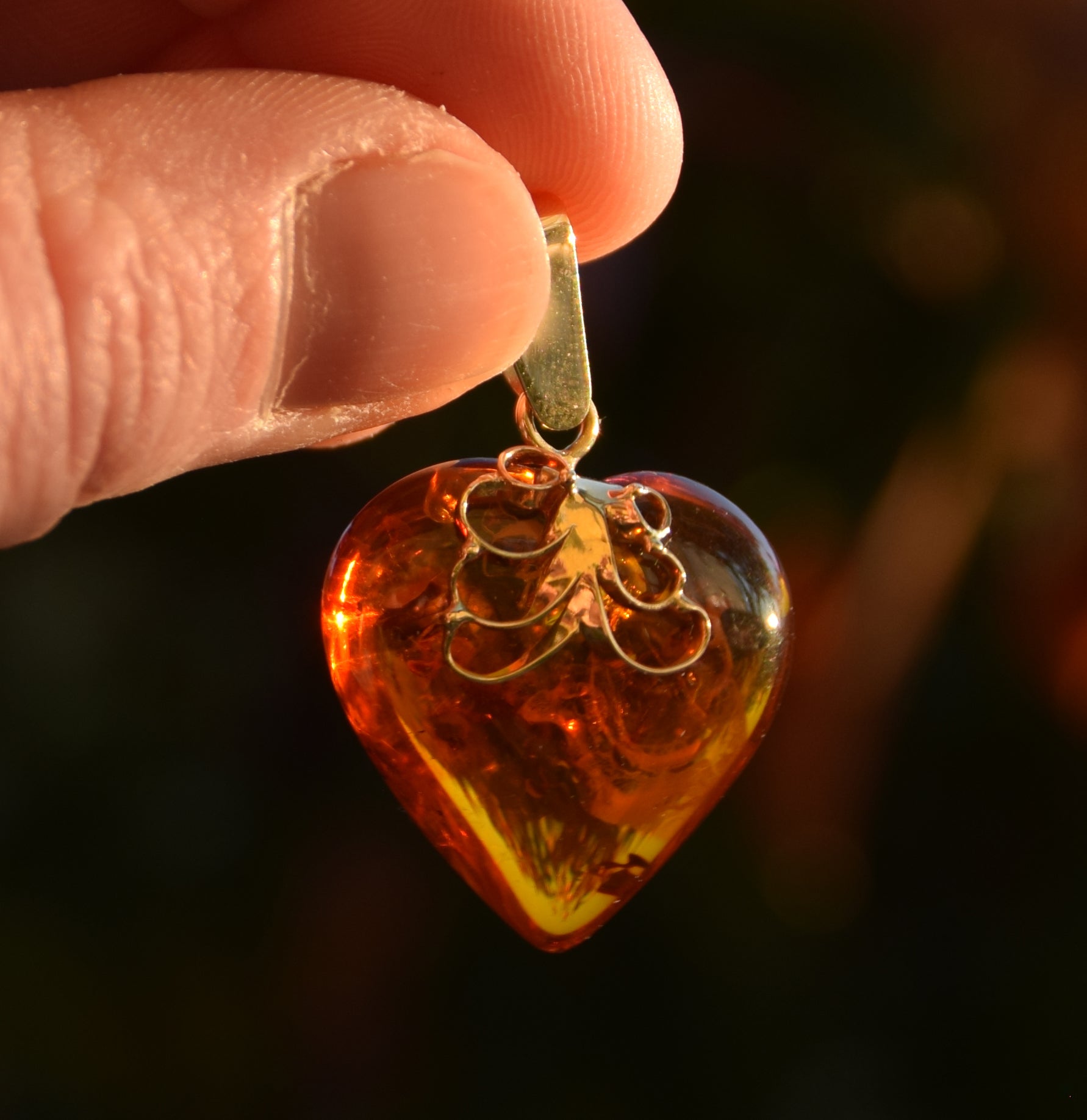 - L'ambra a forma di cuore di classico color miele di bellissimi riflessi dati dalle inclusioni;