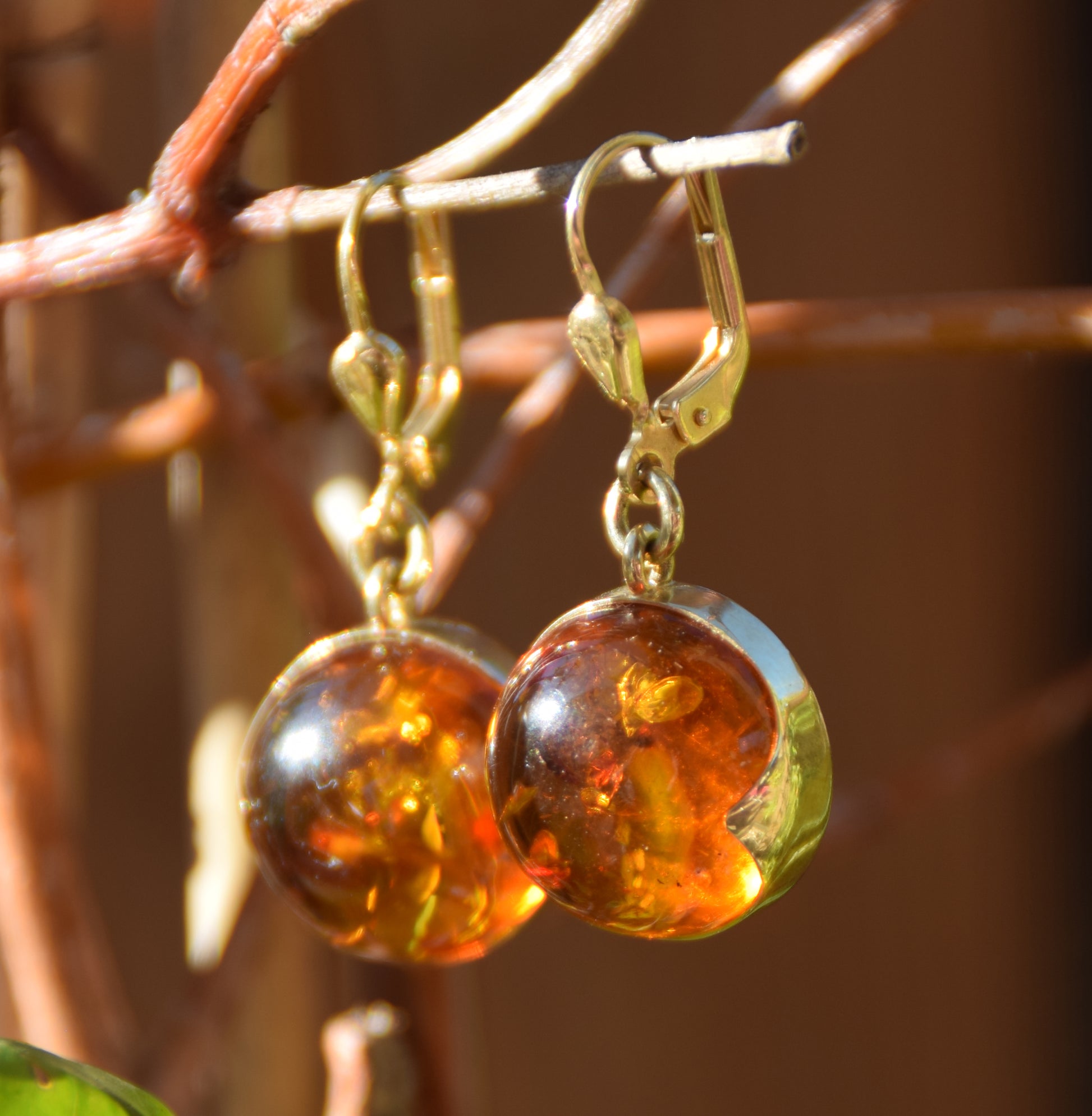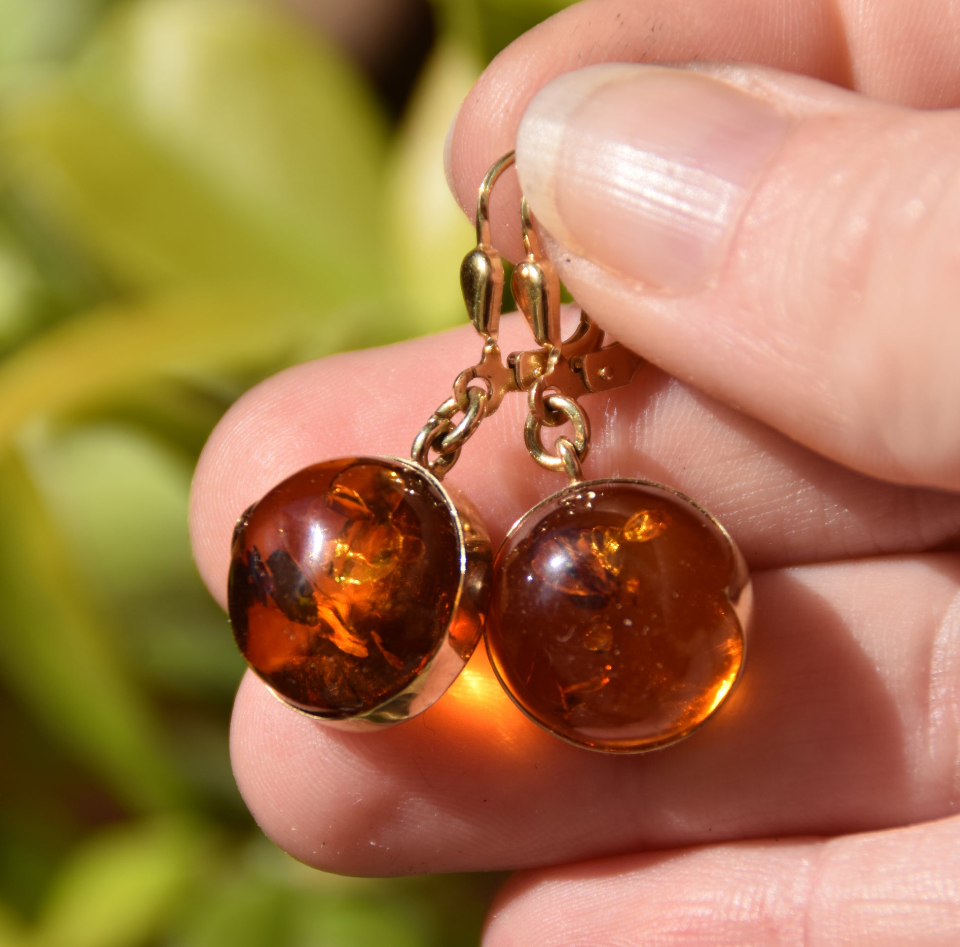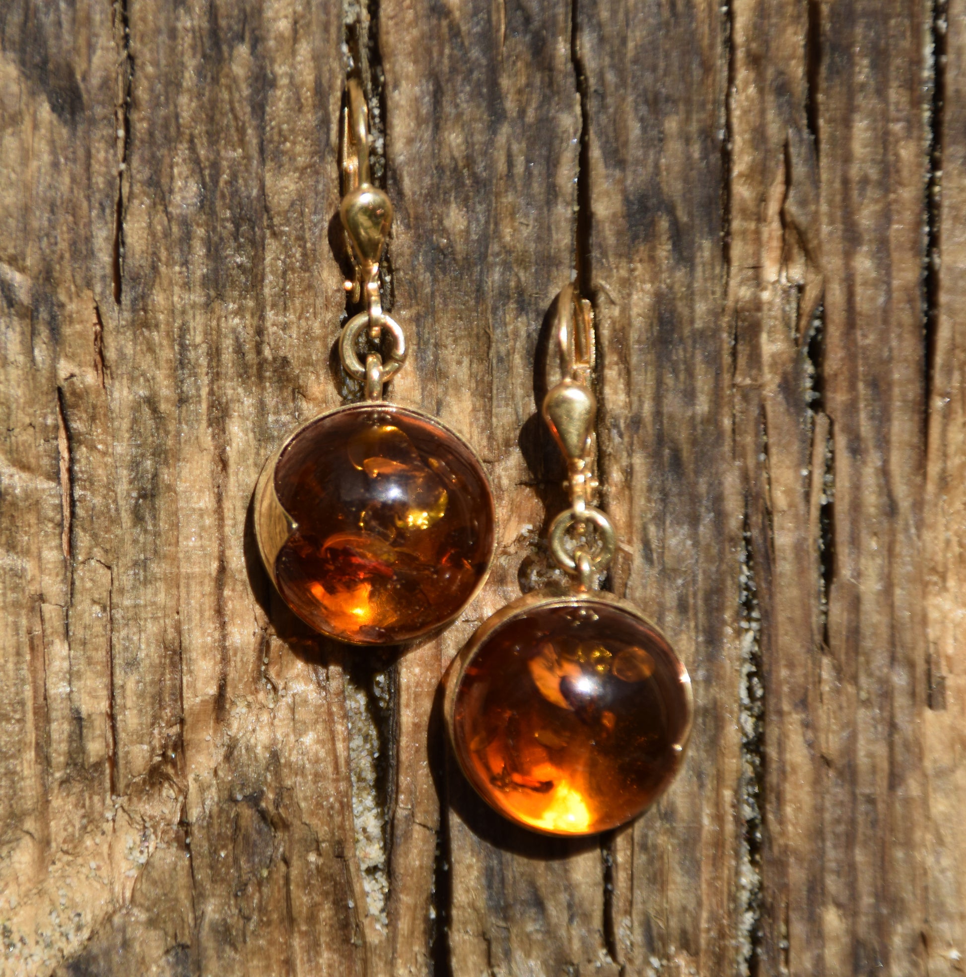 MJ Baltica, orecchini, Ambra naturale Baltica, Argento 925, placcato in Oro 18k, tondo, grande, pendente, artigianale, BZK083