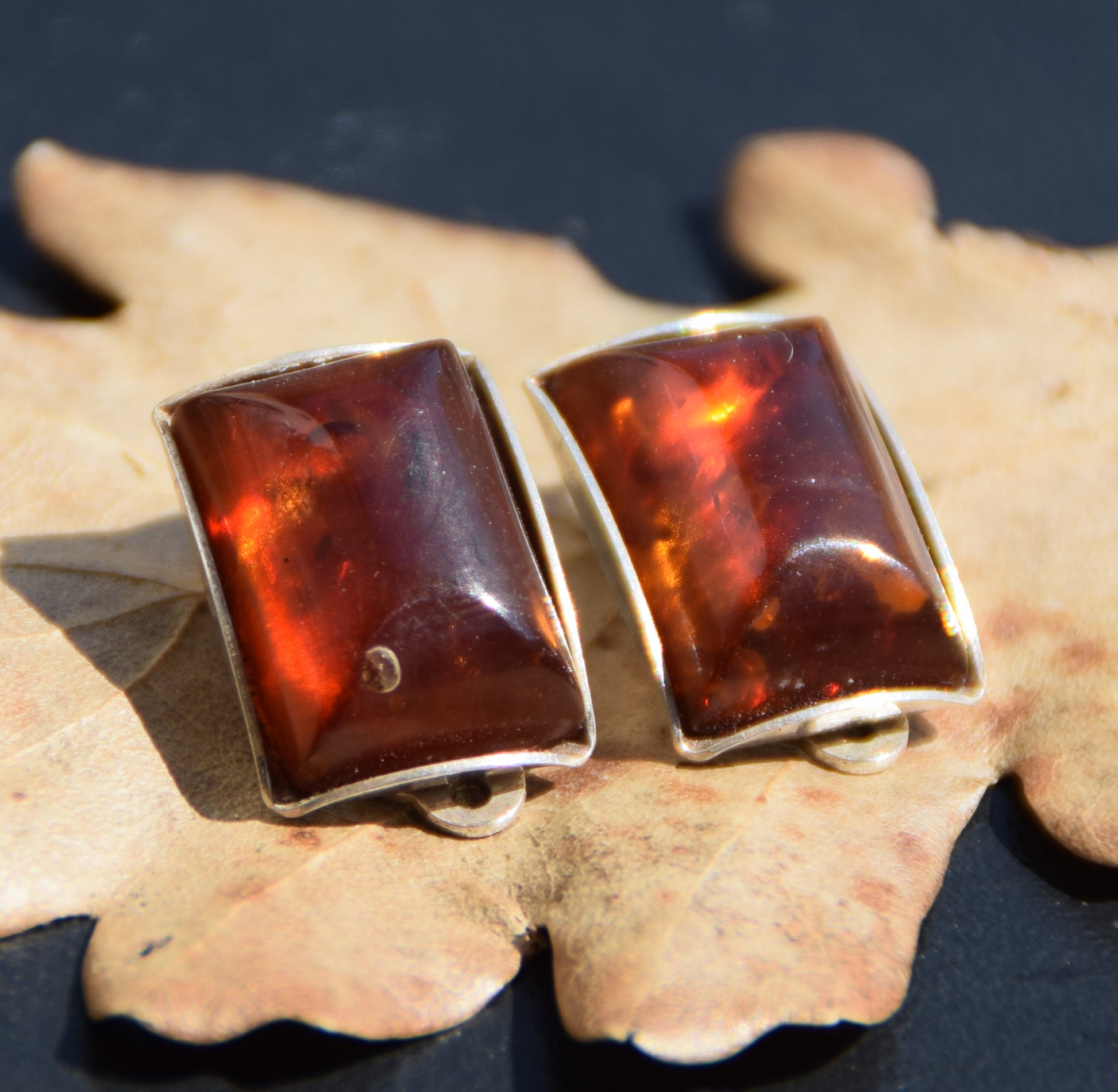 Orecchini a clip rettangolari con Ambra marrone naturale e Argento 925, MJ Baltica, BKK028