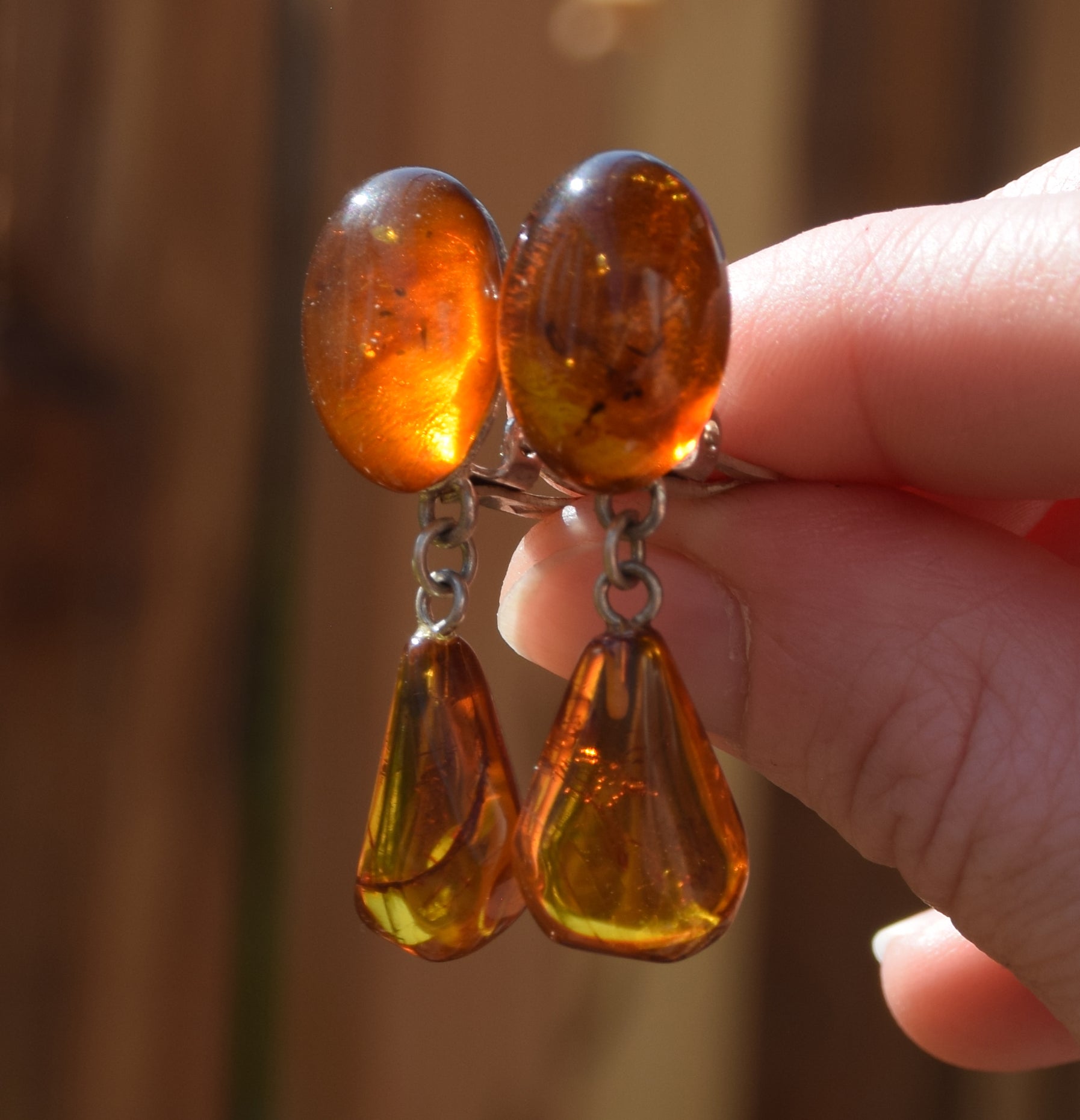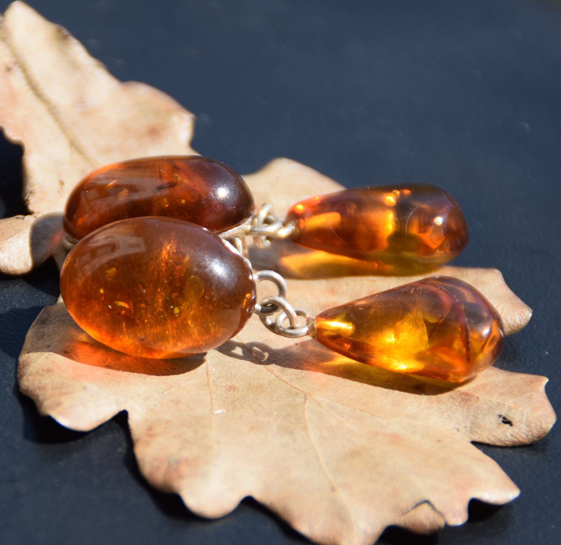 Questi orecchini pendenti con la chiusura a clip combinano luminosa bellezza dell’ambra color cognac naturale con la preziosità dell’argento 925. Le gocce di ambra che pendono dall'orecchino catturano ogni scintilla di luce. Ogni pezzo è realizzato a mano con cura artigianale, garantendo unicità e qualità.