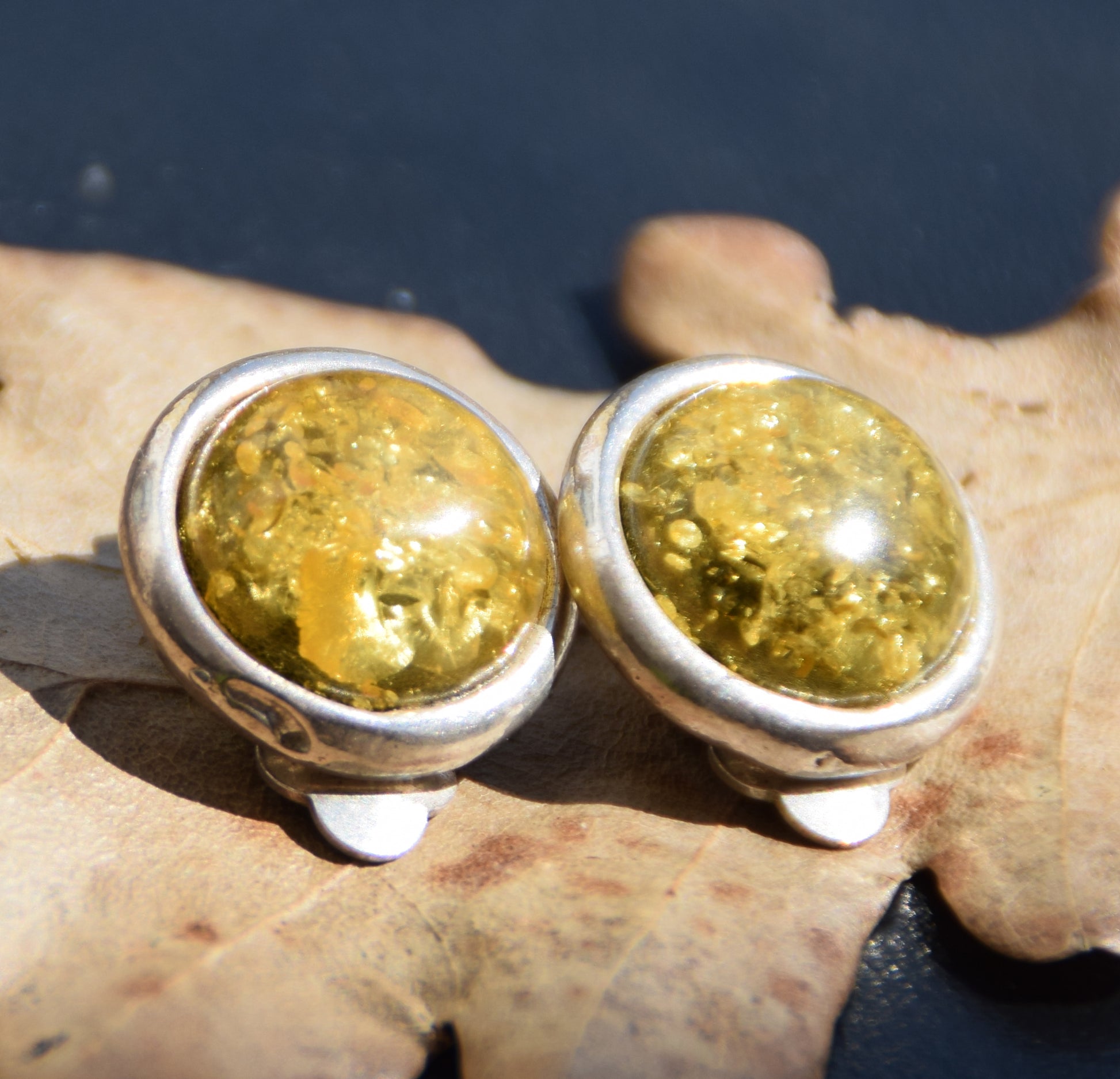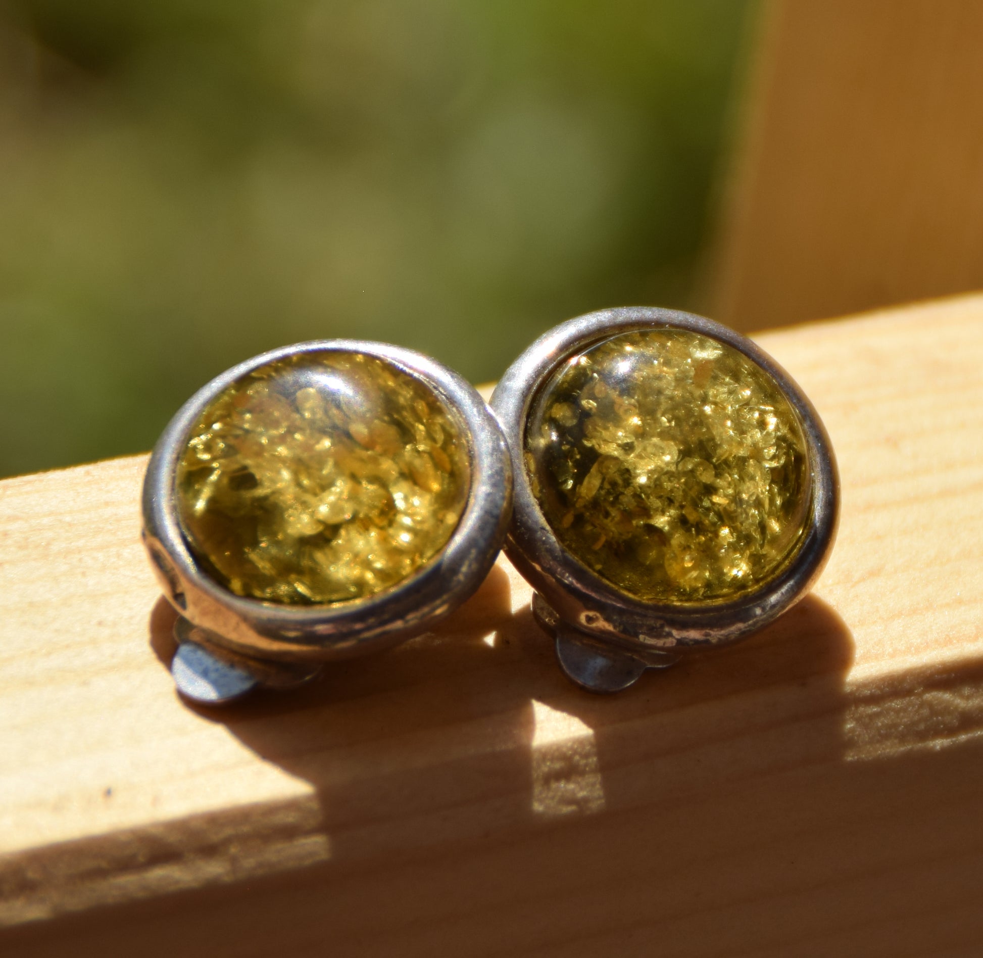 Rotondi orecchini a lobo con la clip con Ambra naturale color verde e Argento 925, MJ Baltica, BKK018